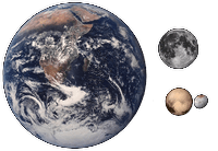 | Größenvergleich zwischen den Paaren Erde–Mond und Pluto–Charon (unten rechts) im gleichen Maßstab (Fotomontage) | |